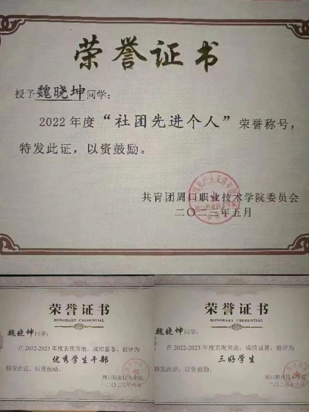 魏晓坤,22级药学专业学生。现任研奕社社长一职。在学习上,积极上进,勤奋好学,学习优异,曾荣获国家励志奖学金,校级“三好学生”,校级“优秀学生干部”,社团“先进个人”等荣誉称号。他在课余时间积极参加学校所举办的活动,如药学技能大赛、经典诵读、简历大赛等活动。在志愿服务方面,参加周口市双创志愿交通执勤活动,家乡社区志愿服务。通过各项活动提高了他的综合素质和个人能力,为以后更好的回报社会奠定基础。感恩资助,照亮了他求学的梦。