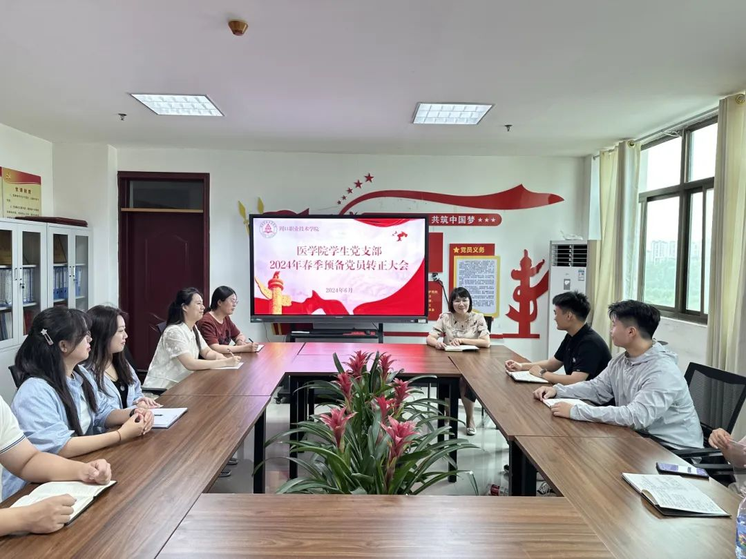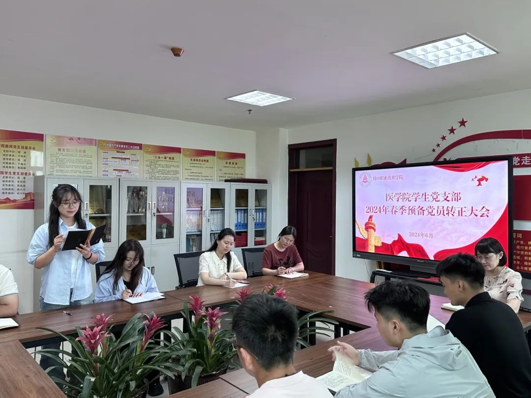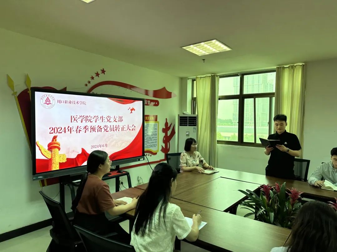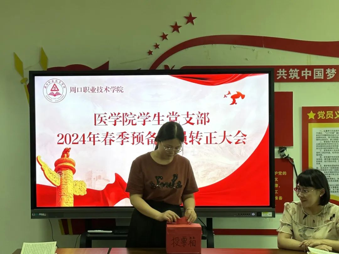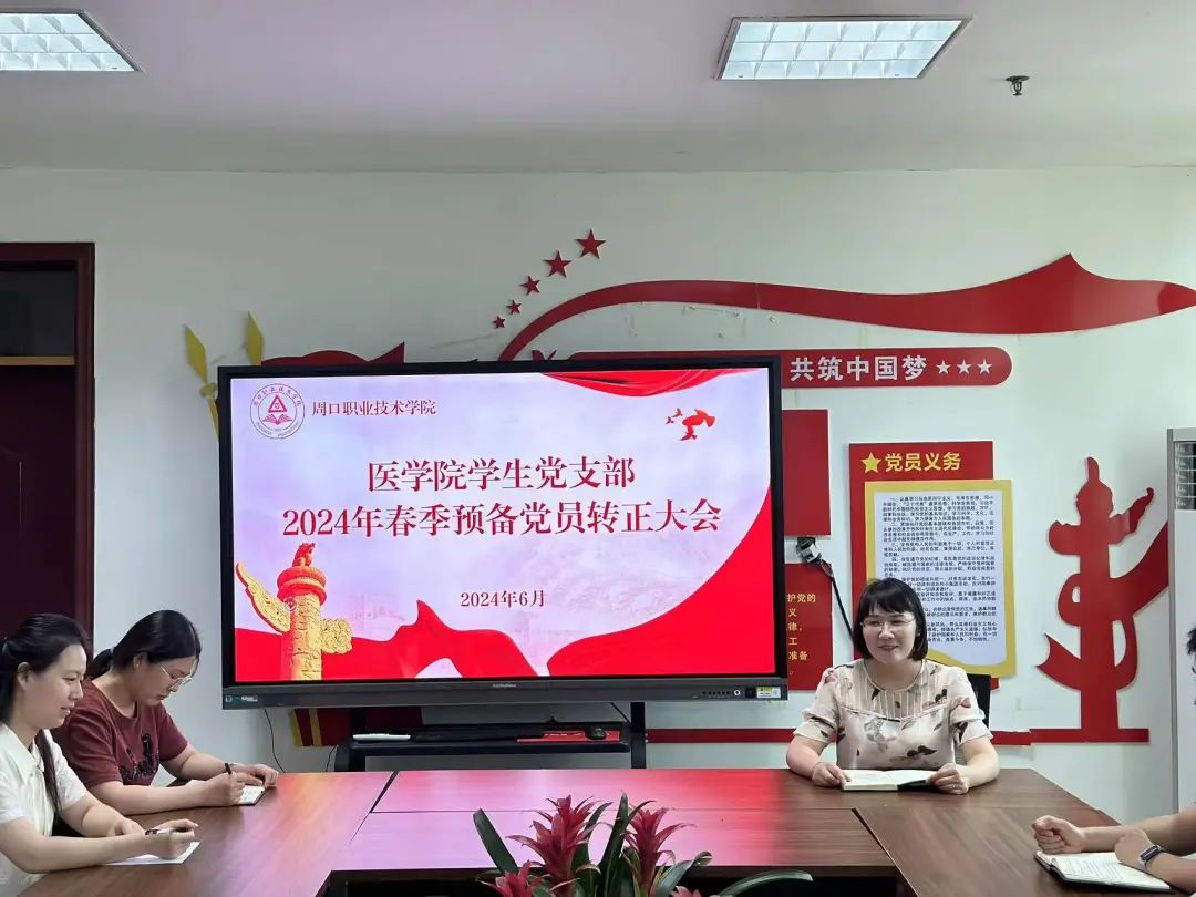 为进一步做好党员发展工作,切实加强党员队伍建设,为党支部注入新鲜血液,增强党支部的凝聚力和向心力,推动党支部的发展建设。6月15日,周口职业技术学院医学院在行政楼四楼党员活动室开展医学院学生党支部2024年春季预备党员转正大会,学生党支部书记聂蕾、学生党支部组织委员李莉莉参加本次会议,大会由李莉莉主持。