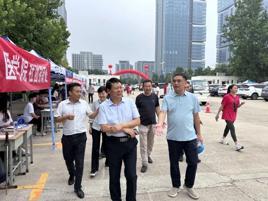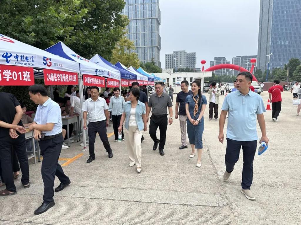 新生报到当天,校长李清臣,副校长李秀萍,学生处处长刘冬霞,保卫处处长李可凡来到迎新现场查看新生报到情况。医学院党总支书记苑建伟、院长刘敏、副院长王向华、学管办主任聂蕾陪同。他们亲切迎接新生及家长,并且慰问奔波在迎新一线的志愿者们,每到一处,他们都关心询问新生报到情况,了解迎新工作安排与需求。领导们的慰问与关怀让新生感受到了学院的温暖,让志愿者们变得更加有动力。