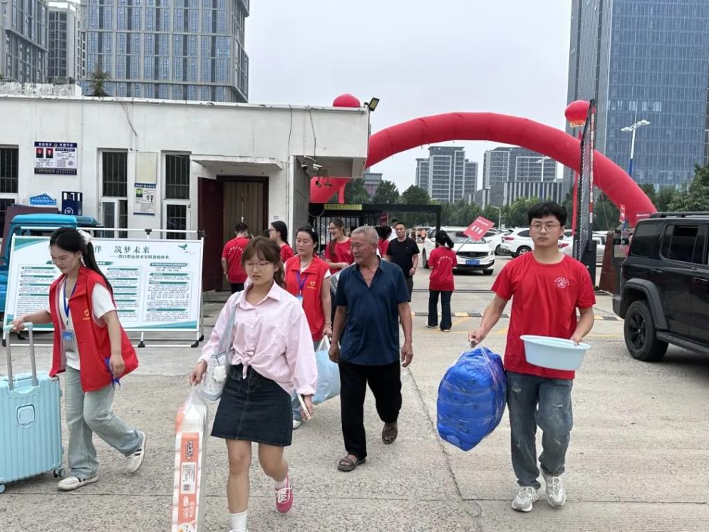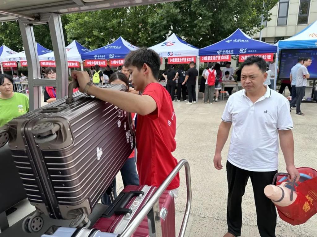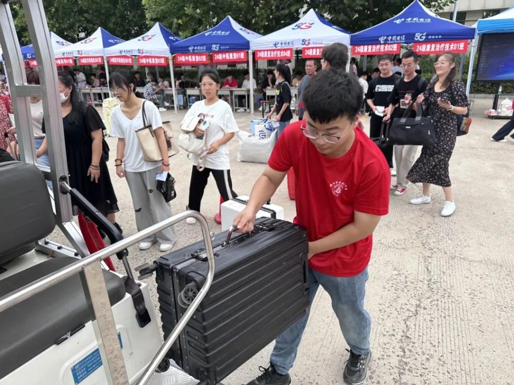而当新生们拖着沉重的行李,来到校门口时,志愿者们又化身为有力的帮手。他们毫不犹豫地伸出双手,接过那沉甸甸的行李,仿佛扛起了一份责任与担当。他们将行李送上行李车,一车车地将新生和他们的行李运送到宿舍楼下。他们穿梭在校园的各个角落,汗水湿透了衣衫,却毫无怨言。