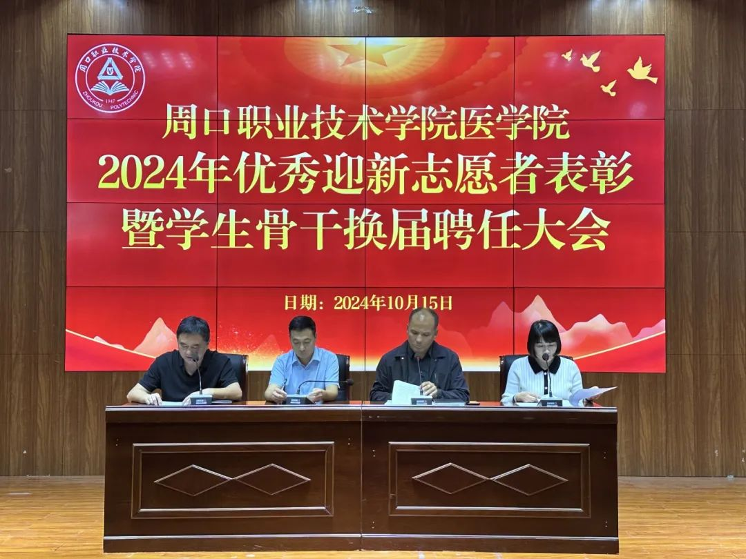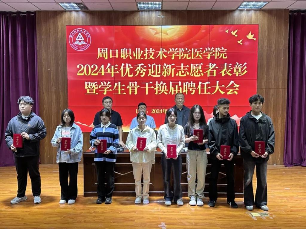 为表彰先进典型,发挥榜样引领作用,更好地加强学生干部队伍建设,发挥学生干部在学生工作中的作用,增强他们的服务意识、责任意识、大局意识,激发他们的工作热情。我院于2024年10月15日在文昌校区报告厅举办了2024年周口职业技术学院医学院优秀迎新志愿者表彰暨学生骨干换届聘任大会。医学院党总支书记苑建伟、副院长郭瑞、副院长王向华、学管办主任聂蕾及医学院百余名学生干部参与本次会议。会议由王向华主持。
