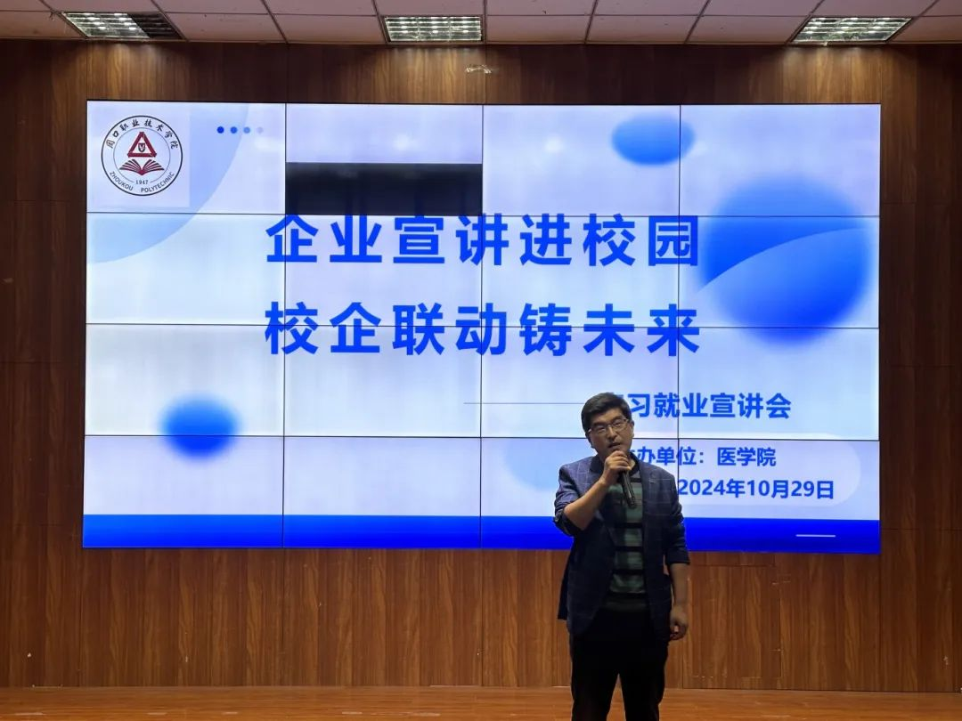进一步加强校企合作,深化产教融合,10月29日下午,医学院在文昌校区多媒体室举办“企业宣讲进校园 校企联动铸未来”宣讲会。邀请周口市规上制药企业工程师为2023级、2024级药学专业全体学生作专题讲座。讲座由医学院副院长王向华主持,医学院班子成员、药学教研室教师代表参加。