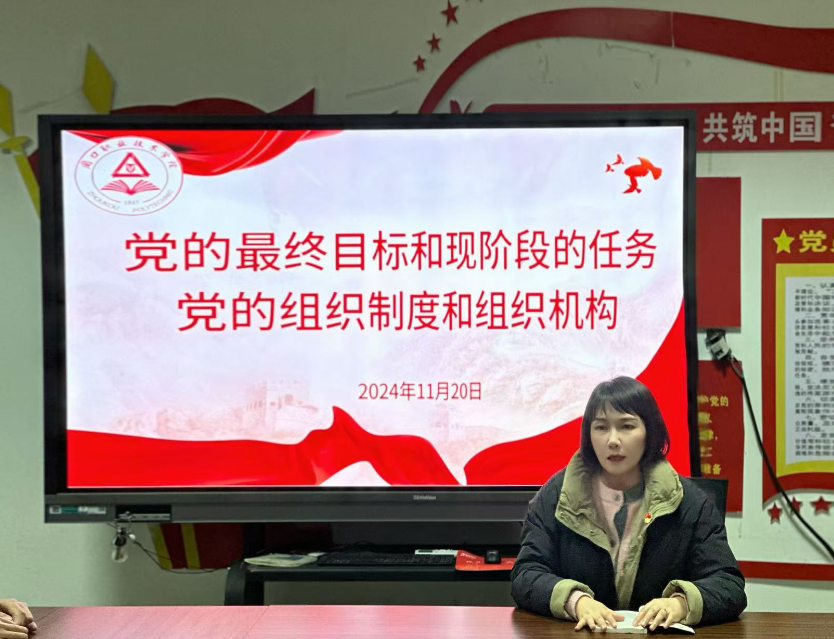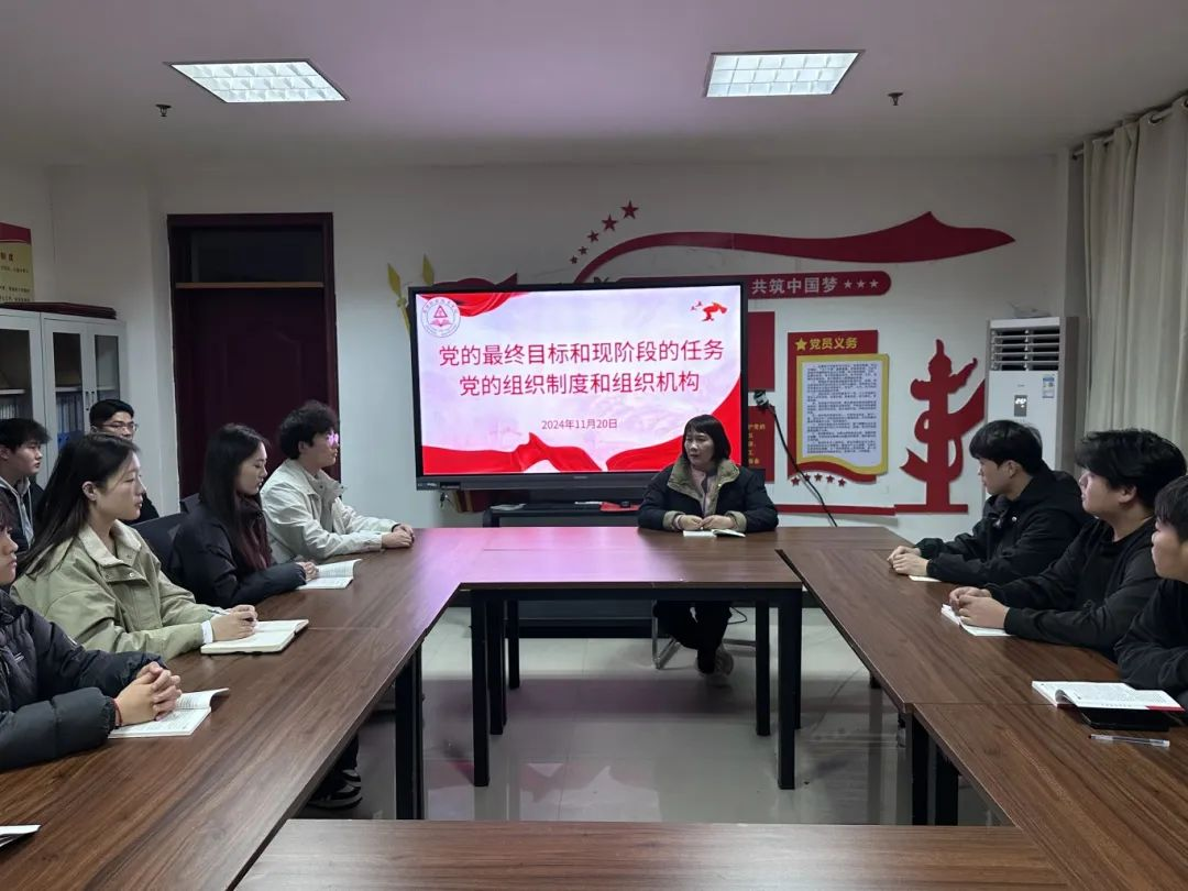 为加强入党积极分子对党的最终目标和现阶段任务的理解,提高入党积极分子对党的组织制度和组织机构的认识,进一步提高入党积极分子的政治思想觉悟和基本理论素养。周口职业技术学院医学院入党积极分子培训班于2024年11月20日中午开展第六讲:“党的最终目标和现阶段的任务、党的组织制度和组织机构”,本次党课由医学院学生党支部书记聂蕾讲解。